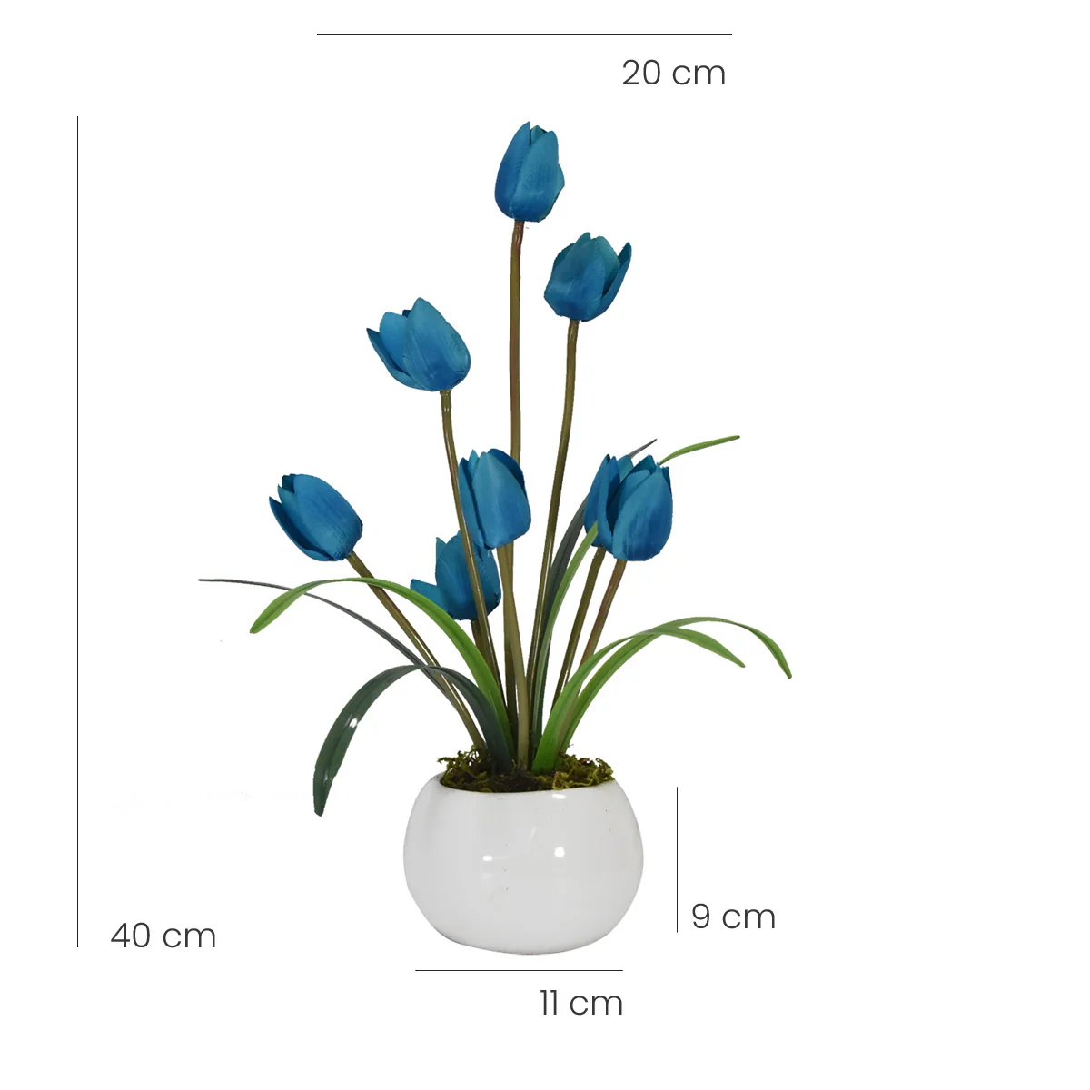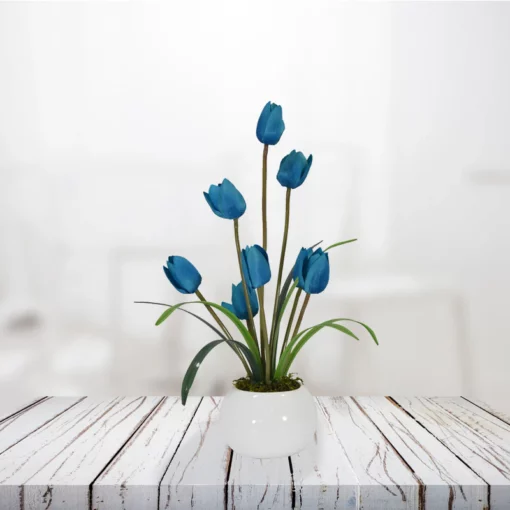 Arreglo de tulipanes de tela, cada arreglo tiene 8 flores y esta acompañado por follajes de plástico tipo espada, montado sobre una base esférica de cerámica esmaltada