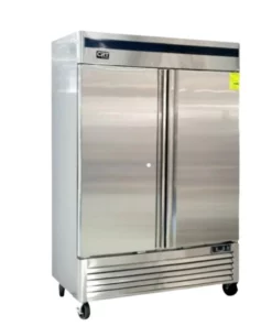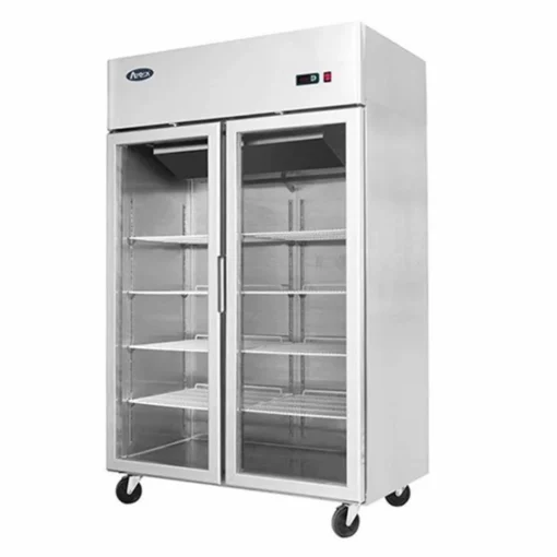 - 2 puertas de cristal con cerradura, “autocierre” y “mantener puerta abierta”, 4 parrillas plastificadas en cada sección, iluminacióninterna, enfriamiento por aire forzado, paro de ventilador al abrir la puerta.